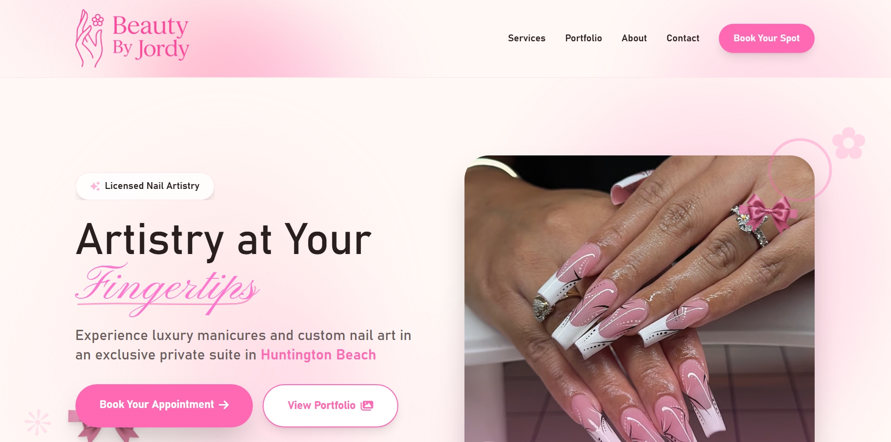 Luxury nail tech needs a website that matches her vibe, and a square site booking page isn't going to cut it. She needs to be able to showcase her work with a cute, elegant aesthetic that match her brand. So, this mockup reflects that to the fullest for future clients.